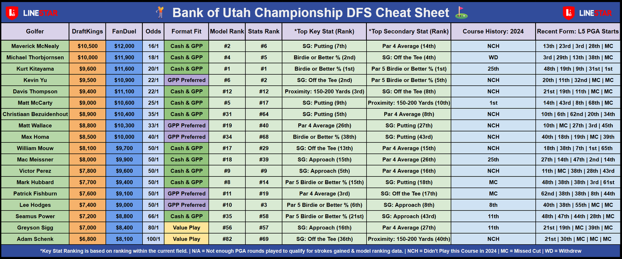PGA DFS Guide + DraftKings & FanDuel Cheat Sheet | Bank of Utah Championship ⛳