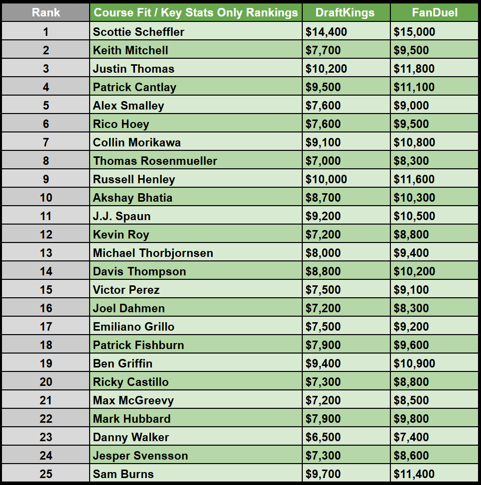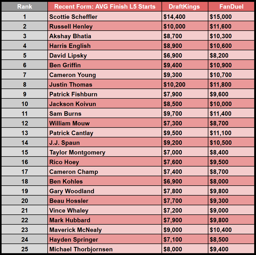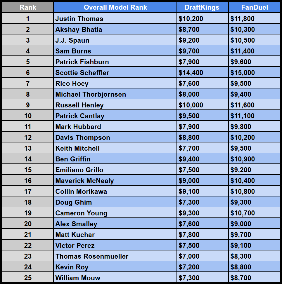 Overall Model Rank: A golfer’s ranking (within the current field) in my personal DFS model, which weighs all of the key stats listed above in this newsletter, as well as factors like course history, recent form, recent average fantasy scoring results, and odds to win.