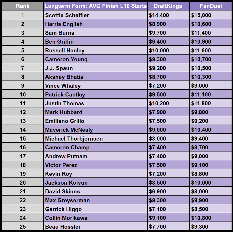 Below are the top 25 ranked golfers in both my overall model and my key stats model. Below that are the top 25 leaders in average finishing position over the last five and last ten starts. The players ranked on these lists do not necessarily mean they are the top golfers I’m targeting for this week's event, but many of these guys should no doubt be favorable DFS options.